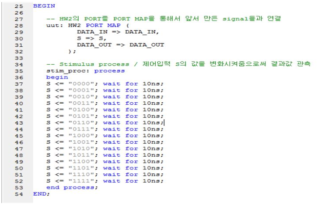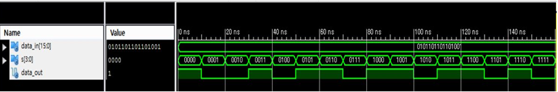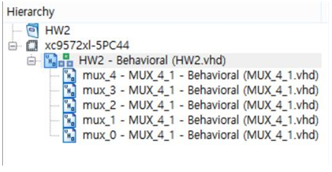 16-to-1 MUX 위의 코드를 synthesize 하면 아래와 같이 16-to-1 MUX 아래에 5개의 4-to-1 MUX가 형성이 된다. 그리고 Test bench 코드를 아까 1-1 과제와 같이 S의 값들을 stimulus process에서 변경해주면 제어입력 S에 따라서 출력값이 변하는 16-to-1 MUX를 표현할 수 있다.