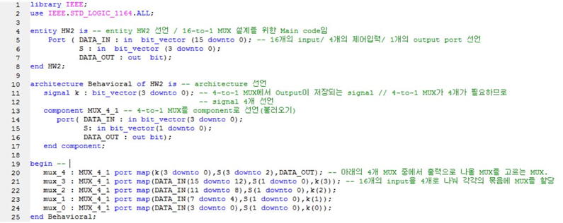 4-to-1 MUX 우선 주어진 과제는 16-to-1 MUX를 Concurrent statements만을 이용하여 Structural modeling method를 통해 구현 해야한다. 이때 16-to-1 MUX를 Structural modeling으로 설계하려면 4-to-1 MUX를 먼저 설계해야하므로 위와 같이 조건에 맞추어 설계를 해보았다. 그 다음 16-to-1 MUX를 설계하는데 이때 mux를 5개 설치해야 하는데 왜냐면 16개의 input을 4개로 나누어 각각의 묶음에 mux를 할당하므로 일단 4개가 필요하며 마지막으로 그 4개의 MUX 중에서 출력으로 나올 MUX를 선택해야 하므로 추가로 하나의 MUX를 만들어야 한다. 이를 토대로 설계하면 아래와 같은 Source code를 얻을 수 있다.